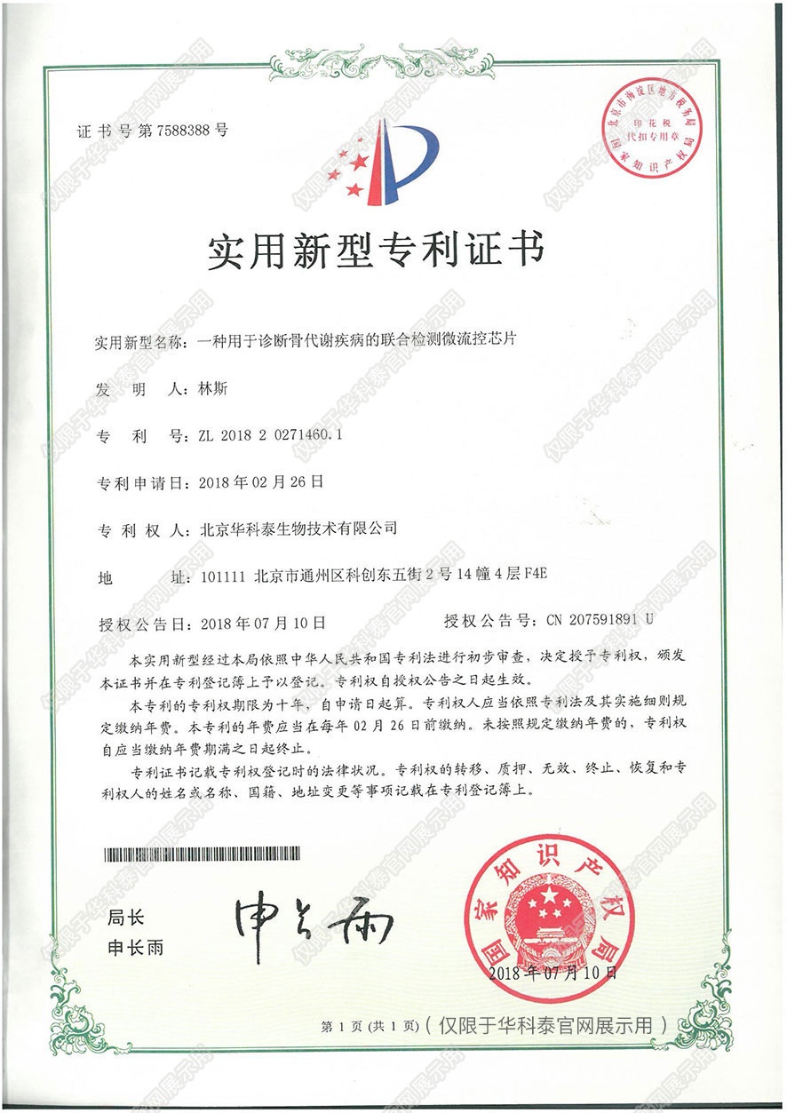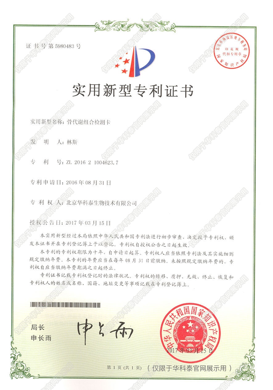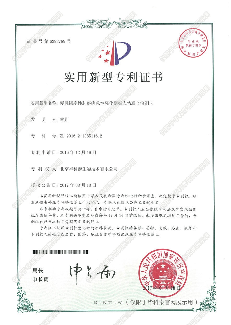 实用新型专利证书- 诊断早期急性心肌梗塞 标志物的联合检测卡